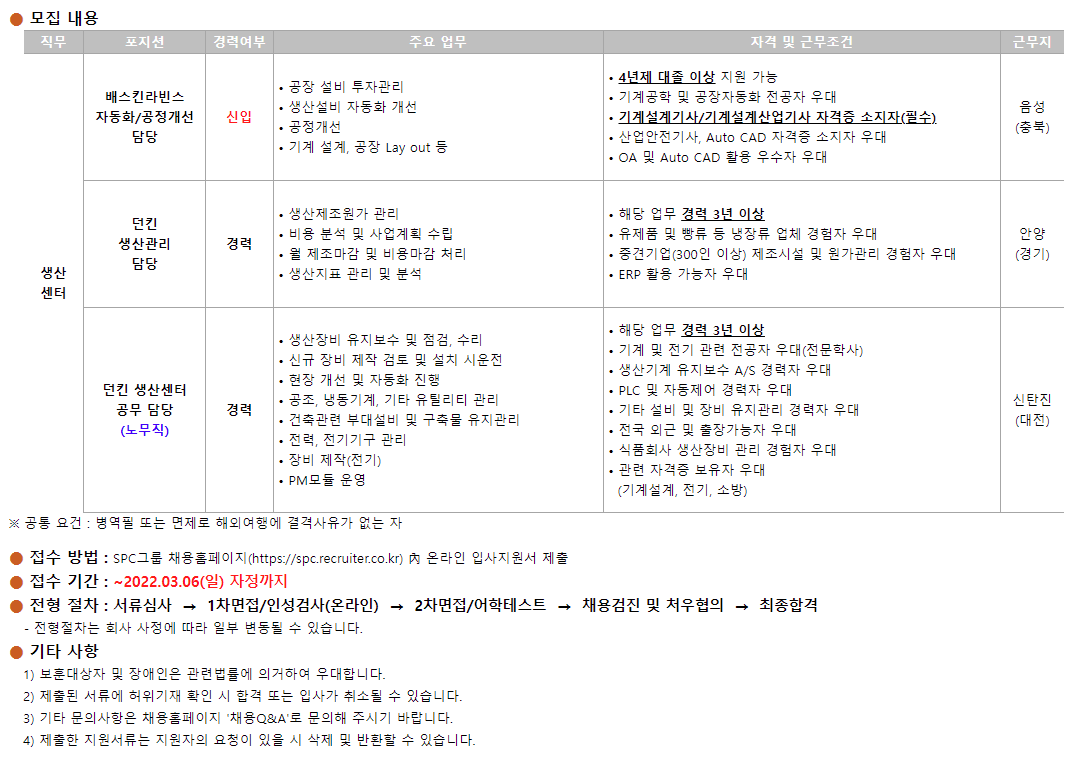 ● 접수 방법 : SPC그룹 채용홈페이지(https://spc.recruiter.co.kr) 內 온라인 입사지원서 제출