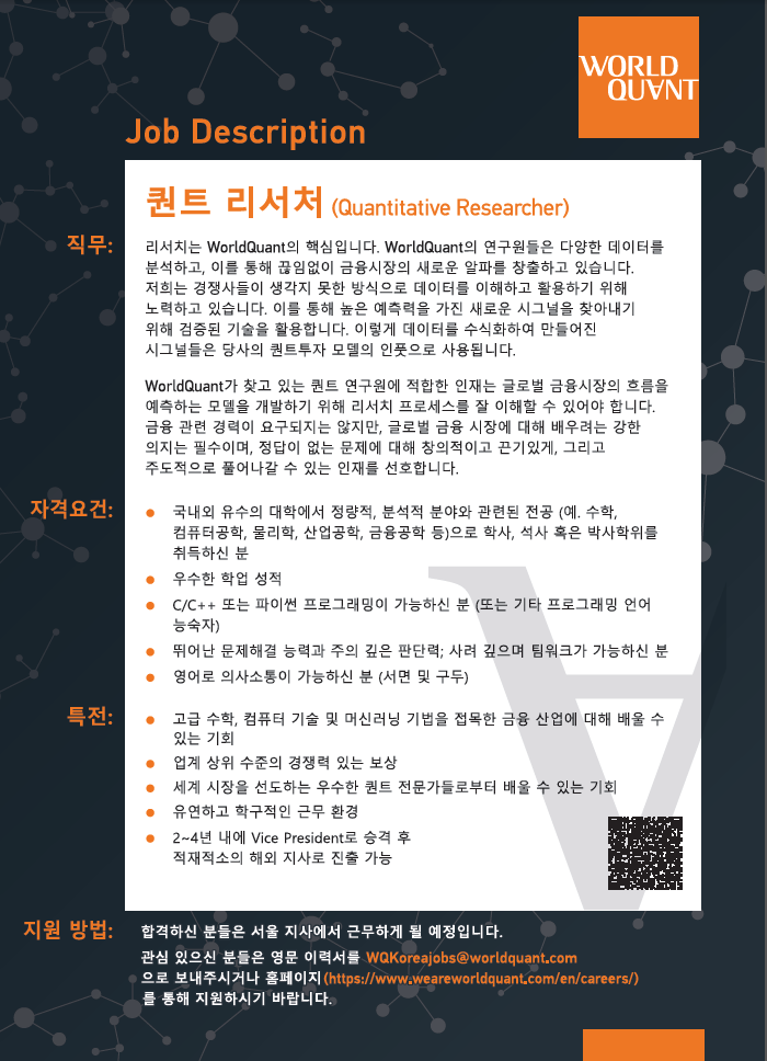 - 지원경로 : 회사 홈페이지(https://www.worldquant.com/career-listing/?location=seoul-south-korea&department=) 또는 이메일(wqkoreajobs@worldquant.com)로 영문 이력서 송부