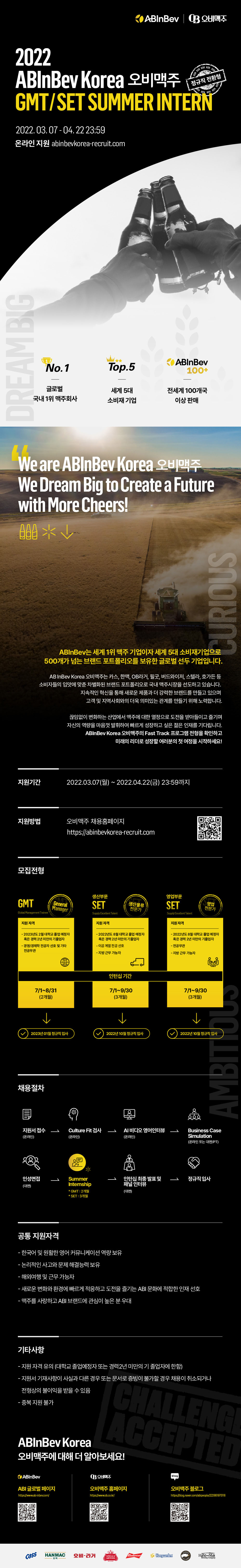 ABInBev는 세계 1위 맥주 기업이자 세계 5대 소비재기업으로 500개가 넘는 브랜드 포트폴리오를 보유한 글로벌 기업이며 오비맥주는 ABInBev의 한국지사로 국내 맥주 시장 1위의 자리를 굳건히 지키고 있습니다.