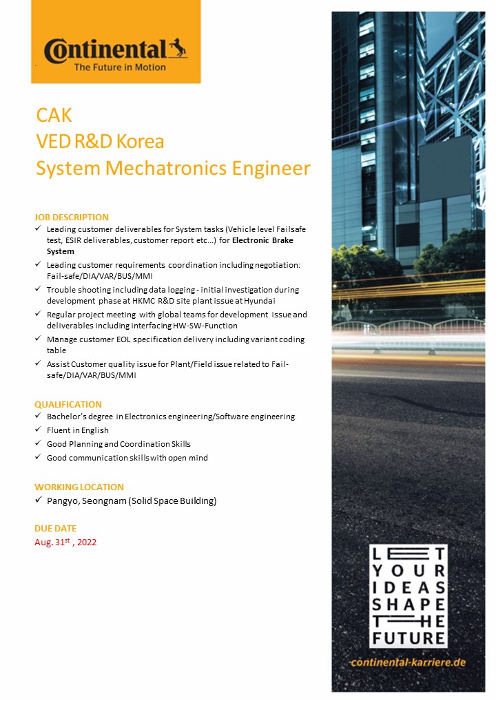 - Engineering experience in electronic or automotive Industry and Hyundai/Kia project experienced as System Engineer preferred and also Freshman is acceptable