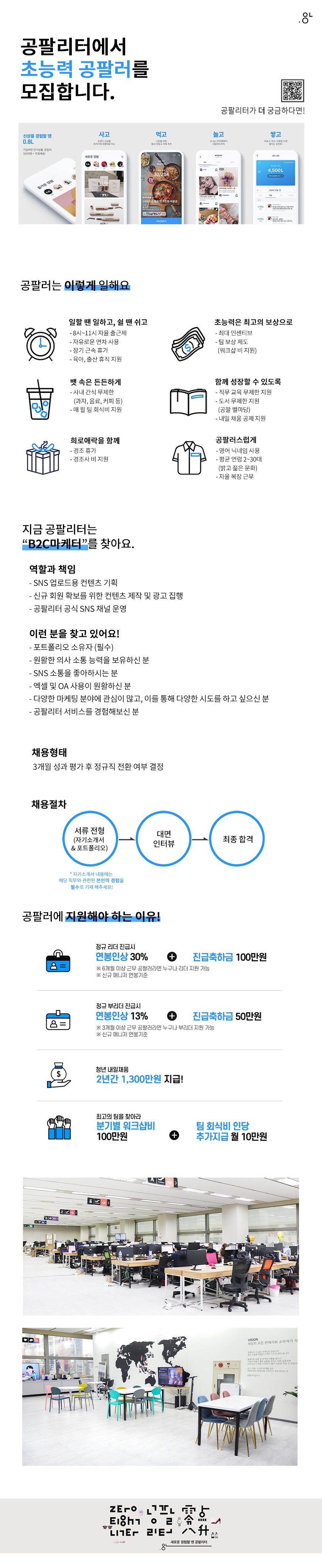 소비자들의 솔직하고 오가닉한 리뷰를 바탕으로 소비자에게 즐거운 경험을, 판매자에게는 충성고객을 제공하는 글로벌 경험 플랫폼 공팔리터 입니다. 우리의 비전을 떨리는 가슴으로 함께하실 멋진 동료들을 찾습니다.