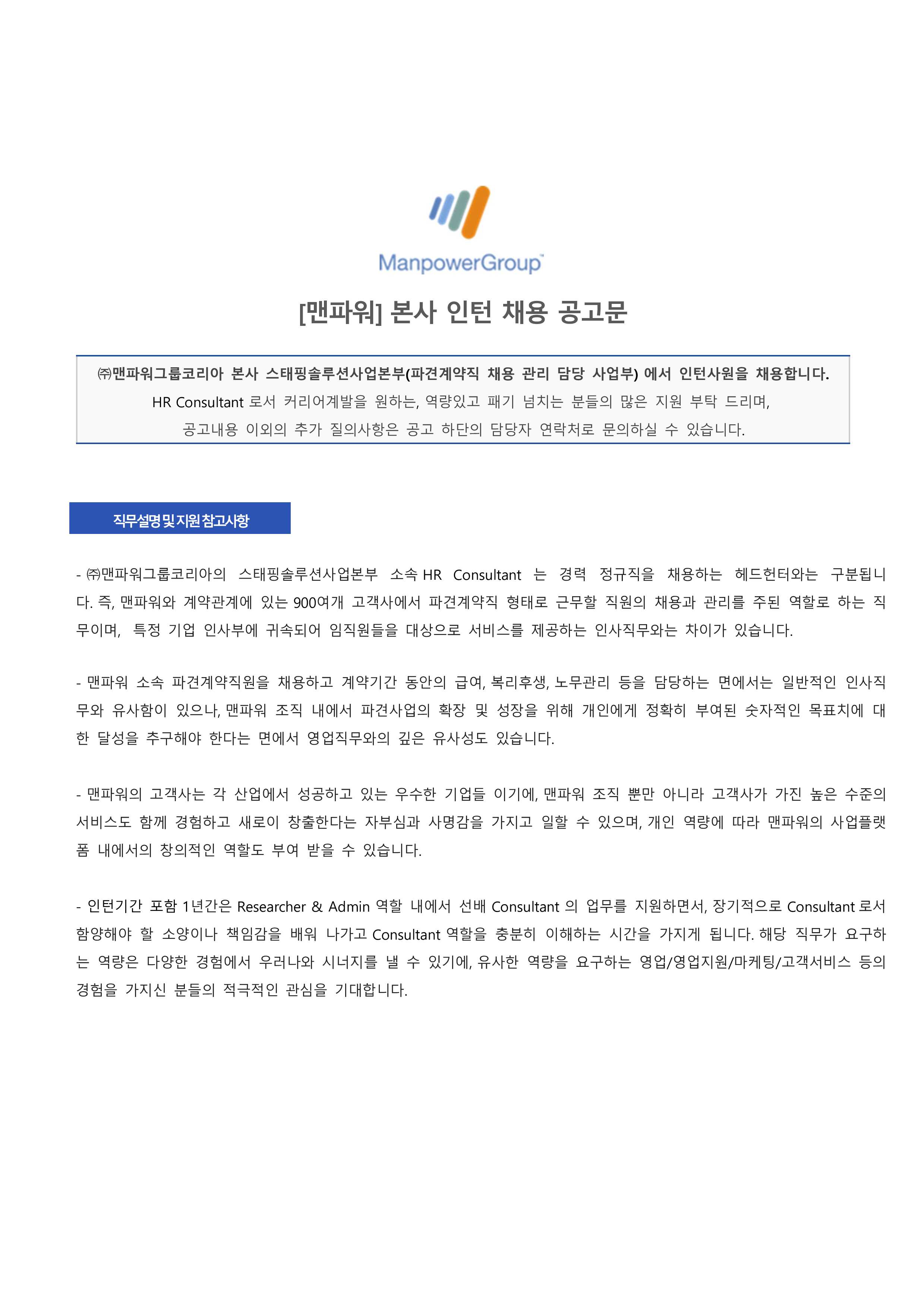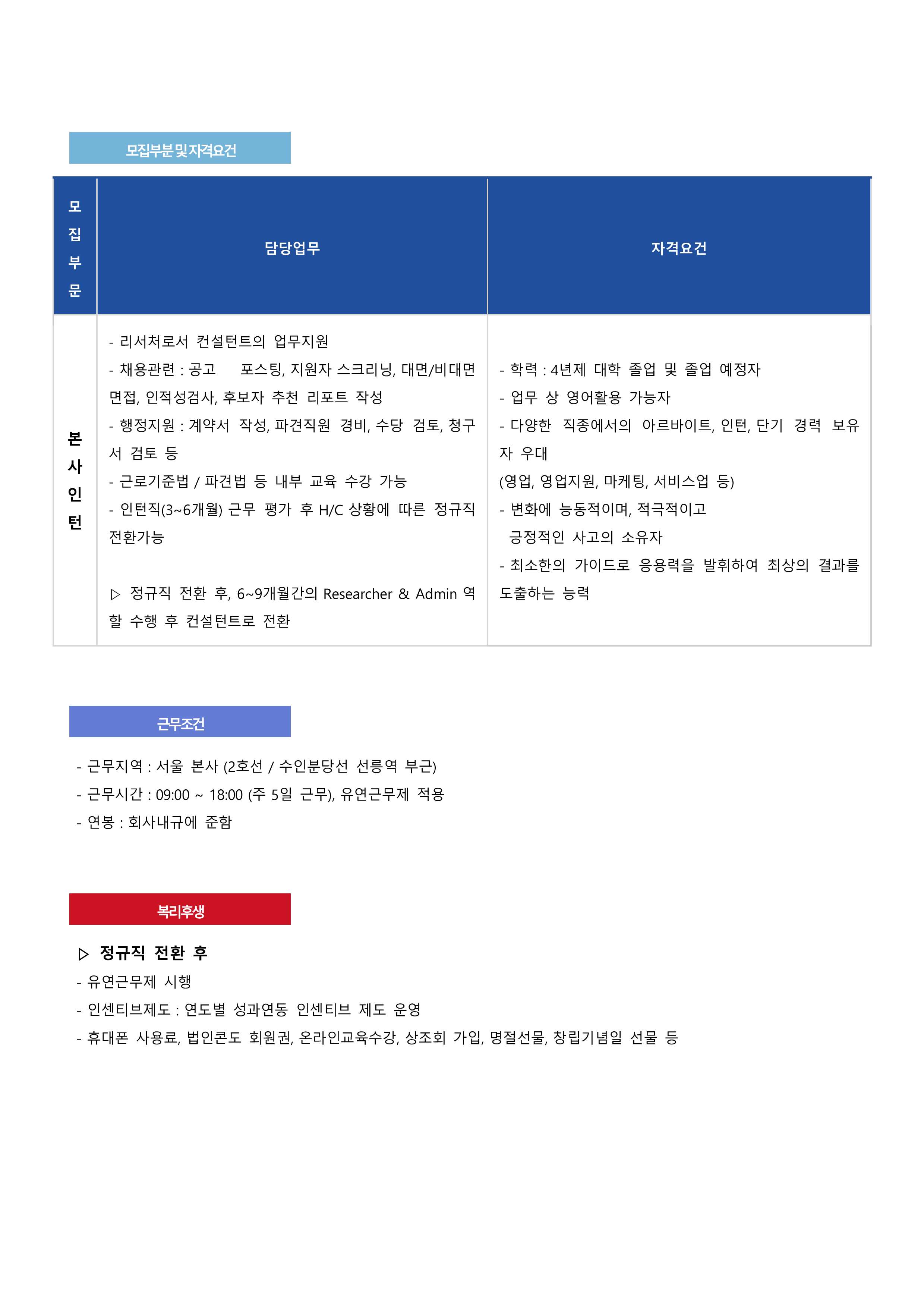 - 인턴직(3~6개월) 근무 평가 후 H/C 상황에 따른 정규직 전환가능