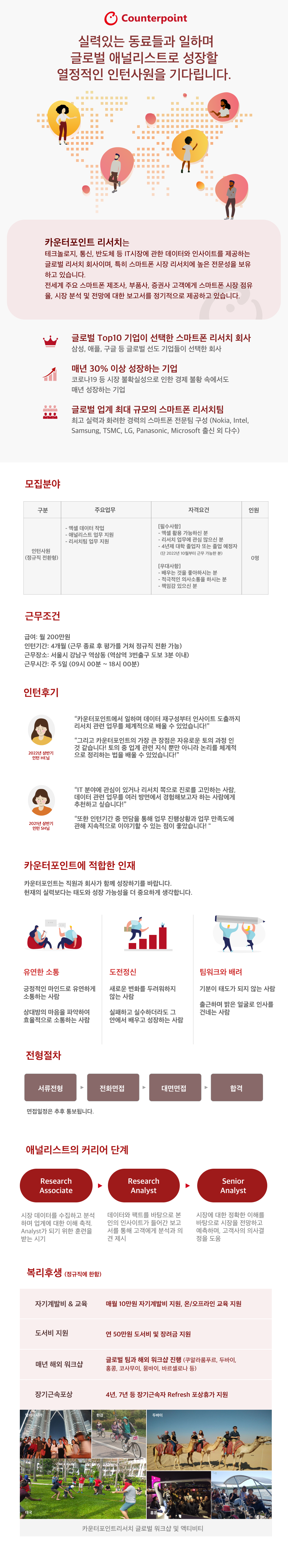 카운터포인트리서치는 테크놀로지, 통신, 반도체 등 IT시장에 관한 데이터와 인사이트를 제공하는 글로벌 리서치 기업이며, 특히 스마트폰 시장 리서치를 전문으로 하고 있습니다. 전세계 주요 스마트폰 제조사, 부품사, 증권사 고객에게 스마트폰 시장 점유율, 시장 분석 및 전망에 대한 보고서를 정기적으로 제공하고 있으며 이번에 리서치팀에서 함께 일할 인재를 찾고 있으니 많은 지원 바랍니다.