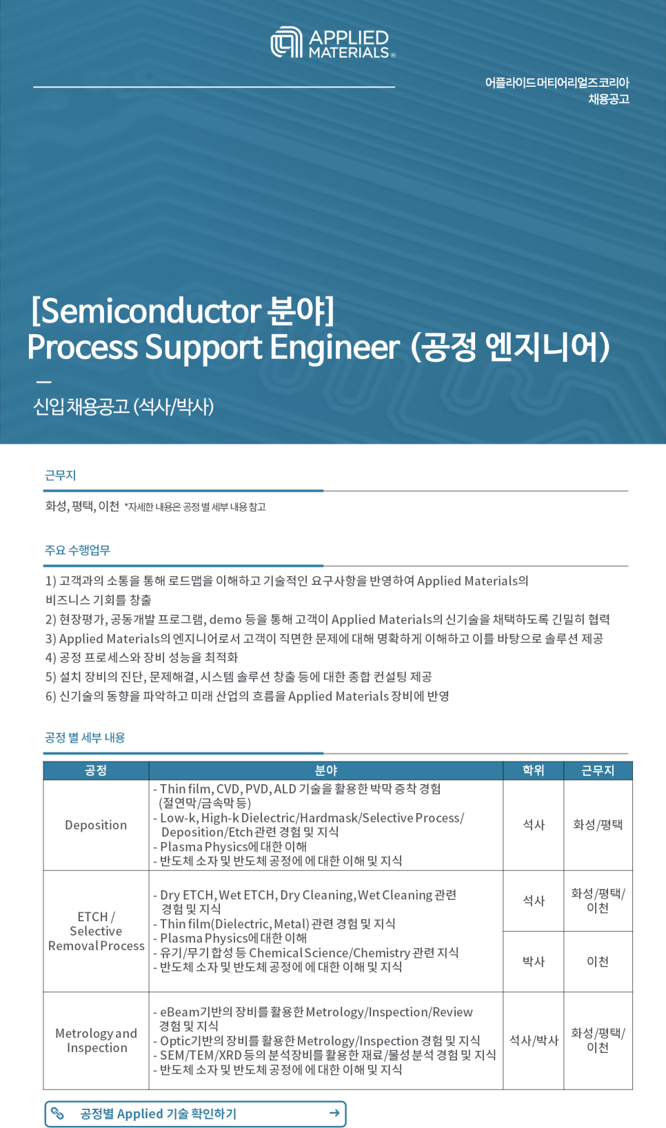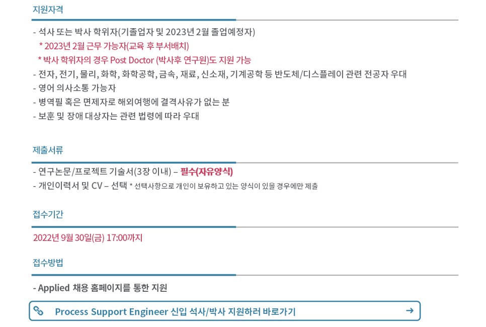 전공: 전자, 전기, 물리, 화학, 화학공학, 금속, 재료, 신소재, 기계 등 반도체 유관전공