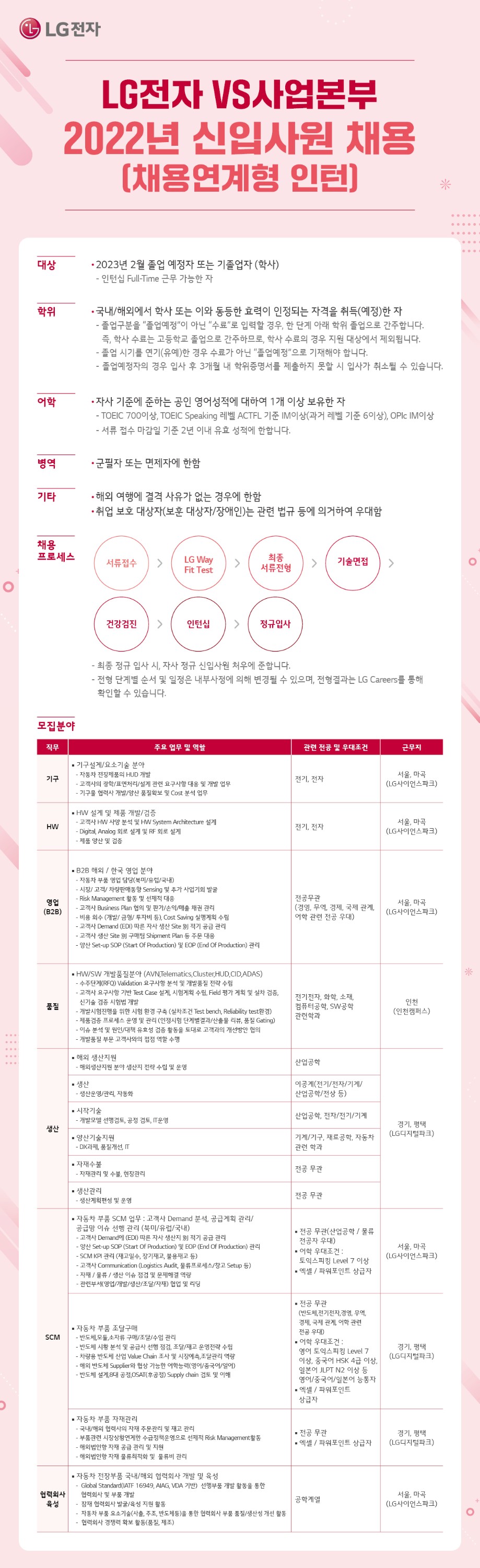▪ 채용 전형 : 서류전형 - LG Way Fit Test(인/적성 검사) - 최종 서류 전형 - 면접 전형 - 인턴십전형(23년 1월 중) - 정규 입사(23년 2월 예정)
