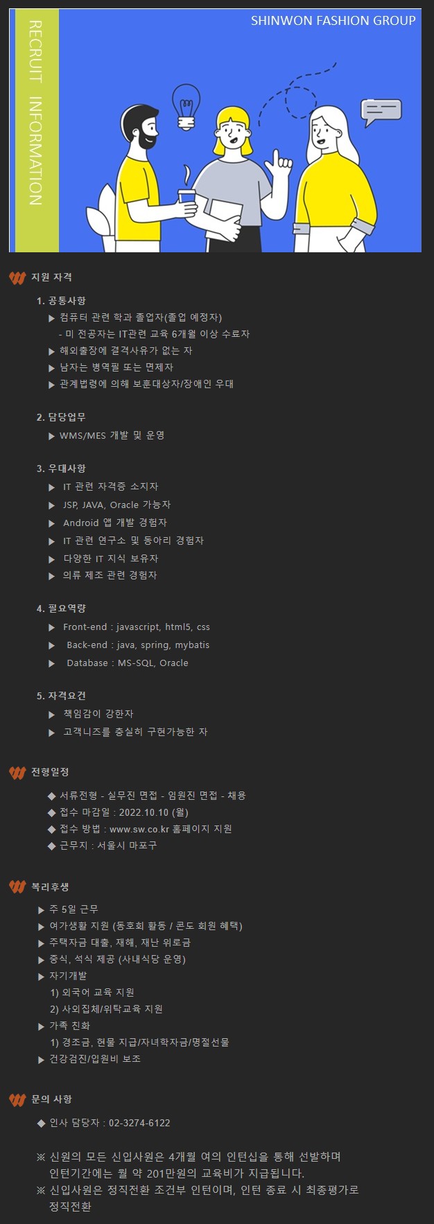 ▶ IT 관련 자격증 소지자▶ JSP, JAVA, Oracle 가능자▶ Android 앱 개발 경험자▶ IT 관련 연구소 및 동아리 경험자▶ 다양한 IT 지식 보유자▶ 의류 제조 관련 경험자