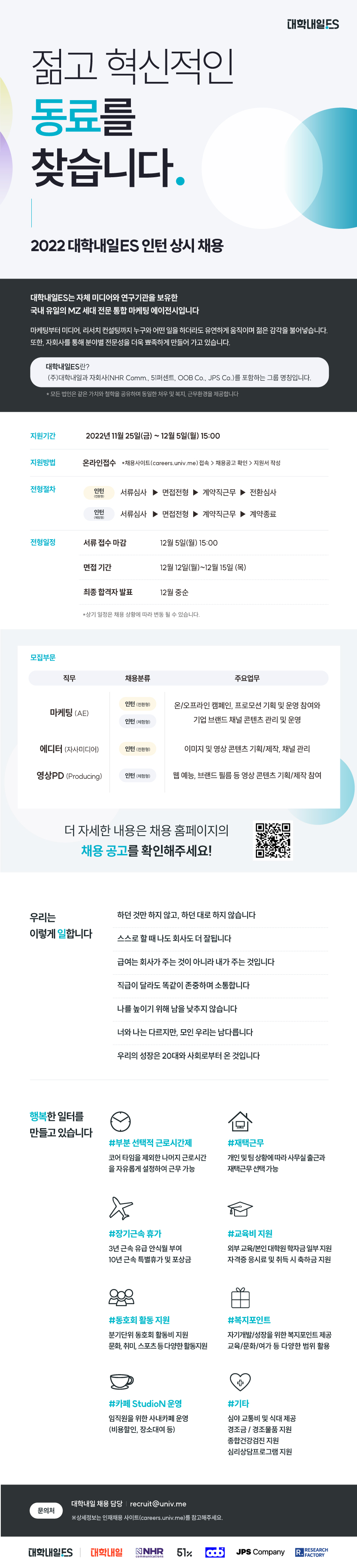 대학내일ES는 (주)대학내일과 각 전문역량으로 특화된 5개의 자회사가 함께 모여 세상을 젊게 혁신하는 '마케팅, 콘텐츠, 비즈니스 전문가그룹'으로 도약하고 있으며, 시대 변화 속 맥락을 읽고 브랜드도 몰랐던 진짜 문제를 정의합니다. *대학내일ES 소속회사(법인)의 처우 및 복지, 근무지 등의 업무 환경은 동일합니다.