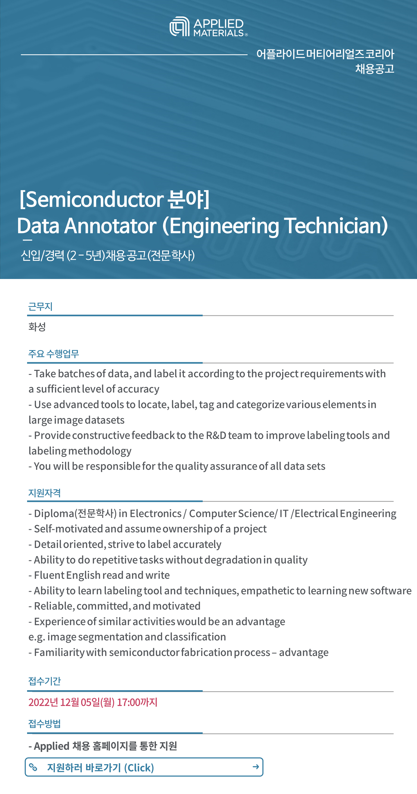 어플라이드머티리얼즈코리아는 반도체, 평판 디스플레이, 태양전지 등의 제조를 위한 혁신 장비, 서비스 및 소프트웨어를 제공하는 세계적 선두 기업 어플라이드머티리얼즈(Applied Materials Inc.)의 한국 법인입니다. 어플라이드머티리얼즈의 기술력은 스마트폰, 평면 TV, 태양전지 패널 등의 혁신적인 제품들이 전 세계 소비자들과 기업들에게 보다 합리적인 가격에 편리하게 사용될 수 있도록 기여해 왔습니다. 어플라이드머티리얼즈는 오늘의 혁신을 내일의 산업으로구현합니다. 어플라이드머티리얼즈코리아는 최첨단 기술을 제공하고 글로벌 선진 사례를 공유하며, 국내 기업으로부터 부품을 조달 받는 등 지난 20여 년 동안 한국 IT 산업의 발전에 기여해 왔습니다.
