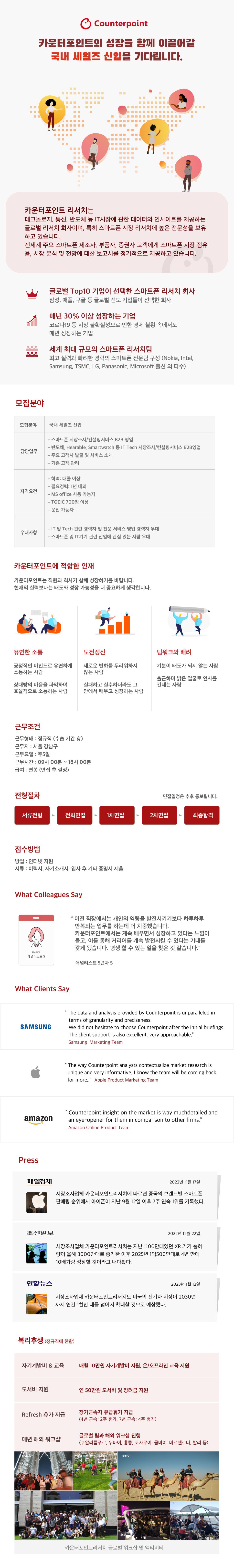 카운터포인트리서치는 테크놀로지, 통신, 반도체 등 IT시장에 관한 데이터와 인사이트를 제공하는 글로벌 리서치 기업이며, 특히 스마트폰 시장 리서치를 전문으로 하고 있습니다. 전세계 주요 스마트폰 제조사, 부품사, 증권사 고객에게 스마트폰 시장 점유율, 시장 분석 및 전망에 대한 보고서를 정기적으로 제공하고 있으며 이번에 세일즈팀에서 함께 일할 인재를 찾고 있으니 많은 지원 바랍니다.