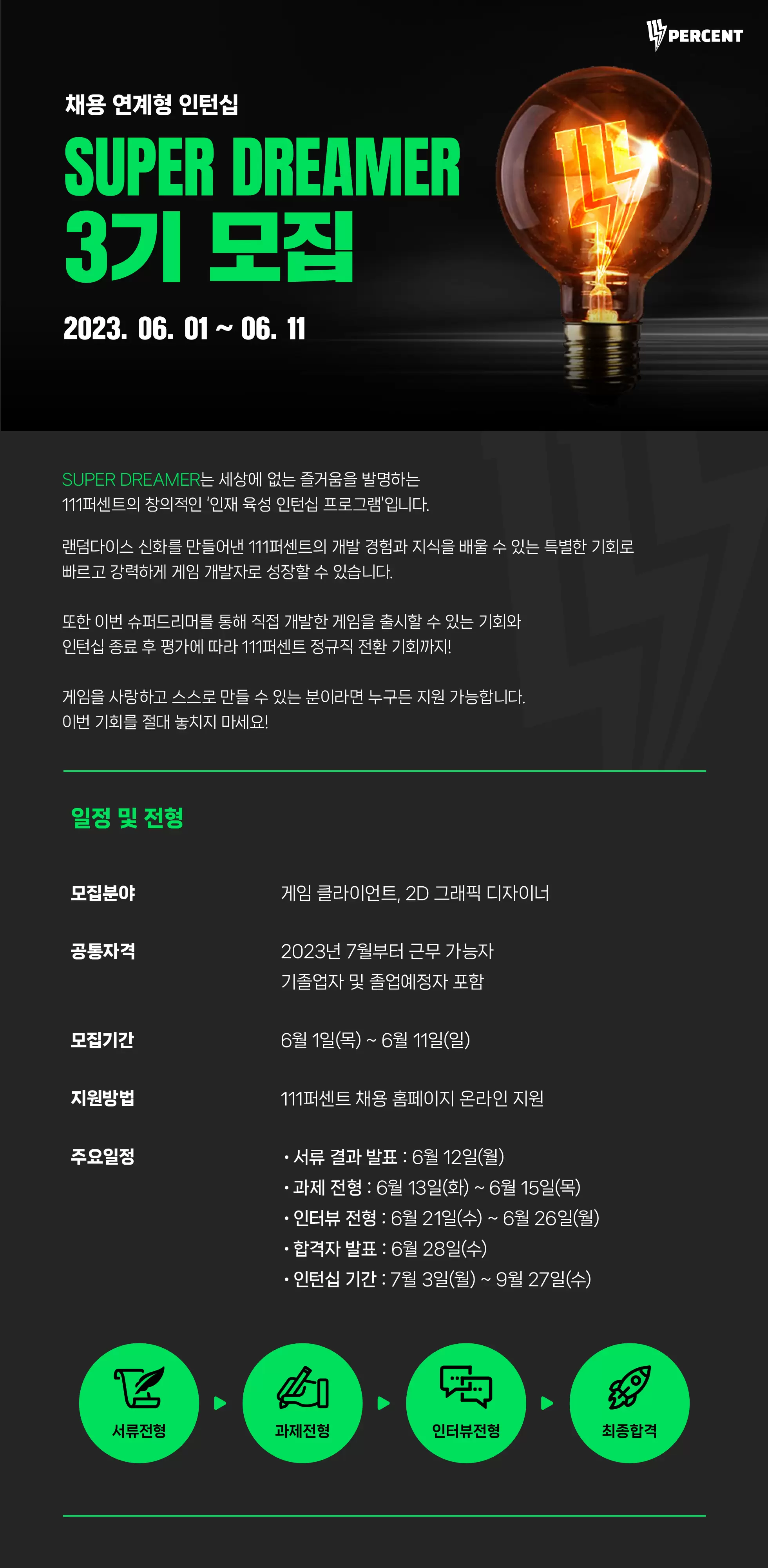 랜덤다이스 신화를 만들어낸 111퍼센트의 개발 경험과 지식을 배울 수 있는 특별한 기회로 빠르고 강력하게 게임 개발자로 성장할 수 있습니다. 또한 이번 슈퍼드리머를 통해 직접 개발한 게임을 출시할 수 있는 기회와 인턴십 종료 후 평가에 따라 111퍼센트 정규직 전환 기회까지!