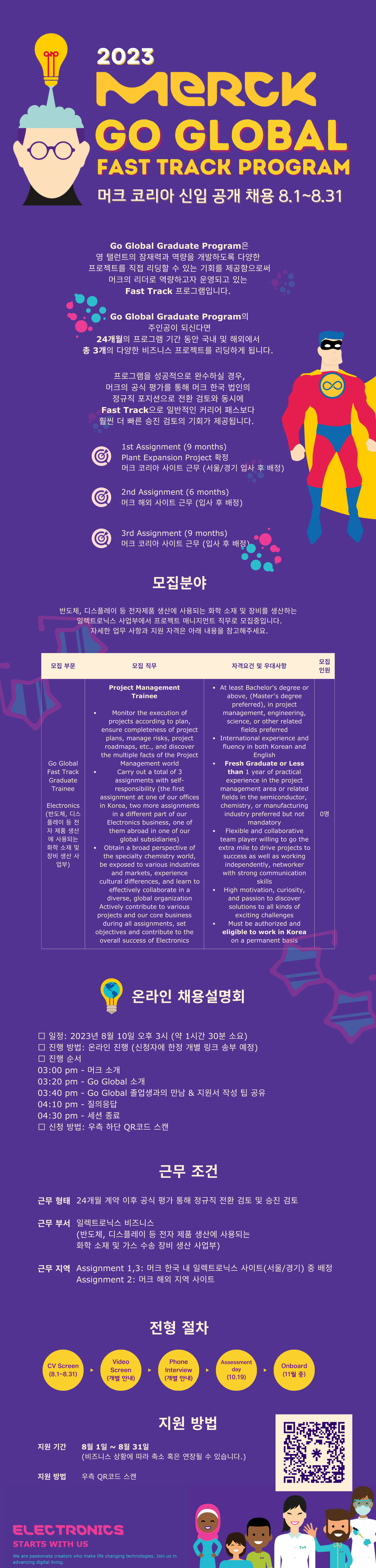 Go Global Graduate Program은 영 탤런트의 잠재력과 역량을 개발하도록 다양한 프로젝트를 직접 리딩할 수 있는 기회를 제공함으로써 머크의 리더로 역량하고자 운영되고 있는 Fast Track Graduate 프로그램입니다.