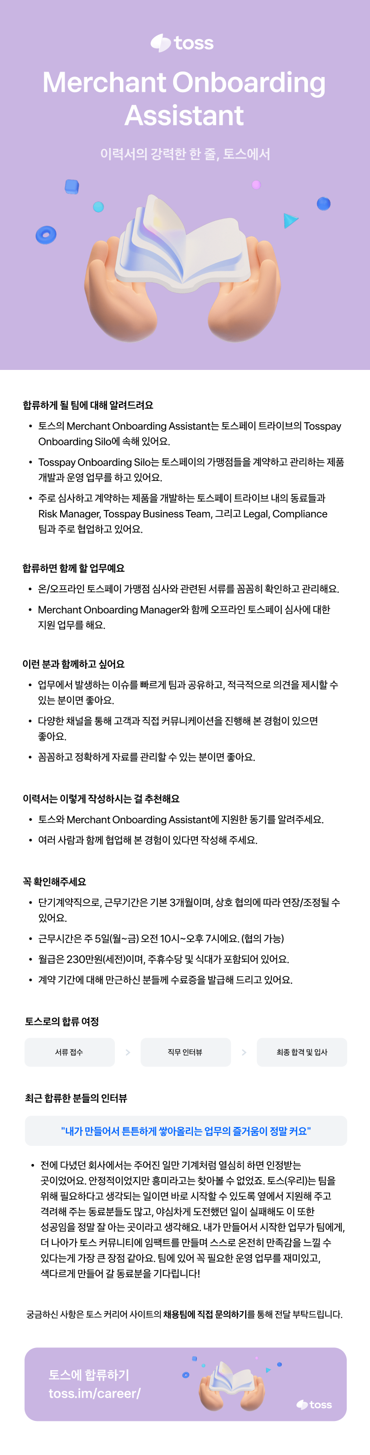 지나온 성장보다 더 큰 도약을 위해, 토스커뮤니티가 꿈꾸는 '간편하고 안전한 금융생활을 누리는 대한민국'을 함께 만들어갈 멋진 동료가 필요합니다.