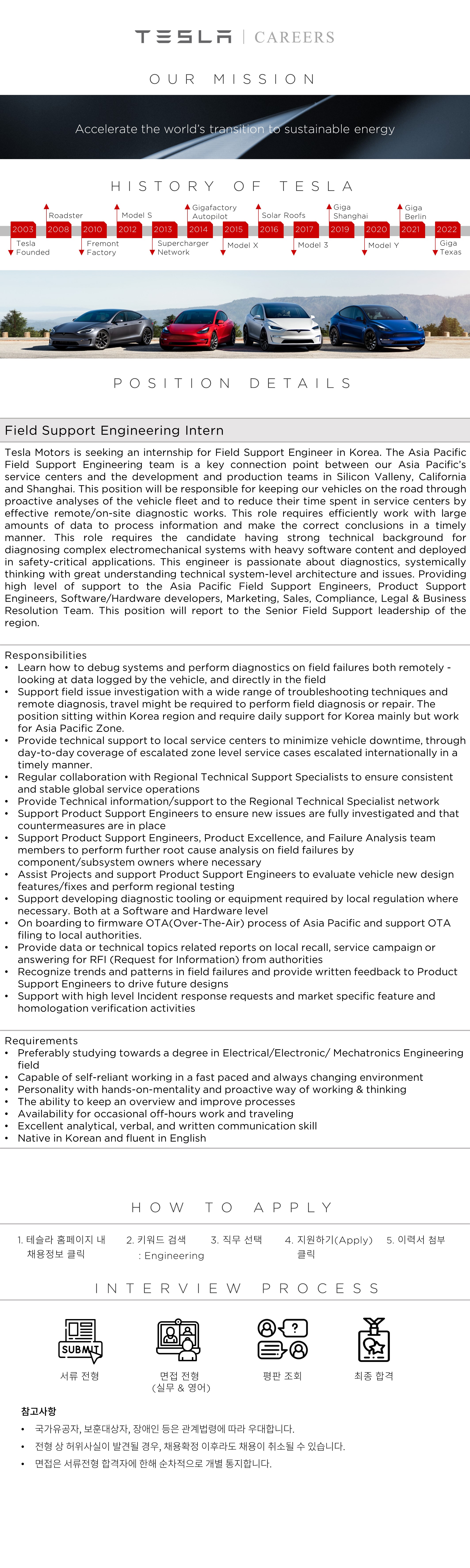 [Tesla Korea] Field Support Engineering Intern (3 Months Contract), Yongin, Gyeonggi, Korea
