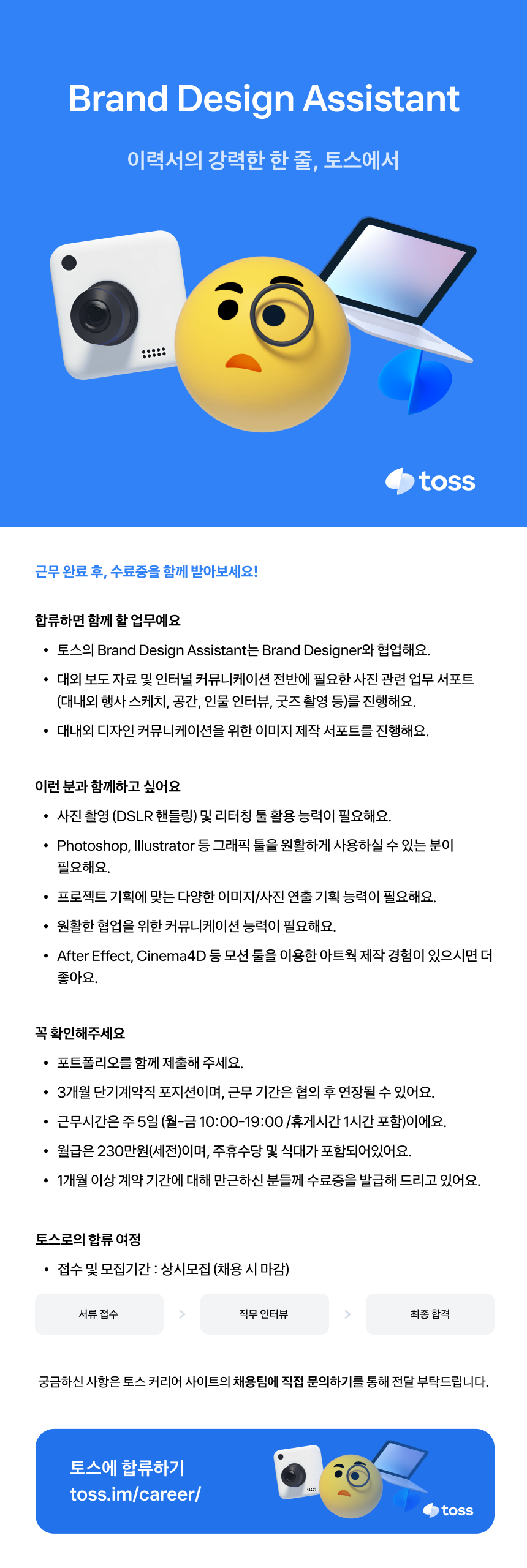 지나온 성장보다 더 큰 도약을 위해, 토스커뮤니티가 꿈꾸는 '간편하고 안전한 금융생활을 누리는 대한민국'을 함께 만들어갈 멋진 동료가 필요합니다.