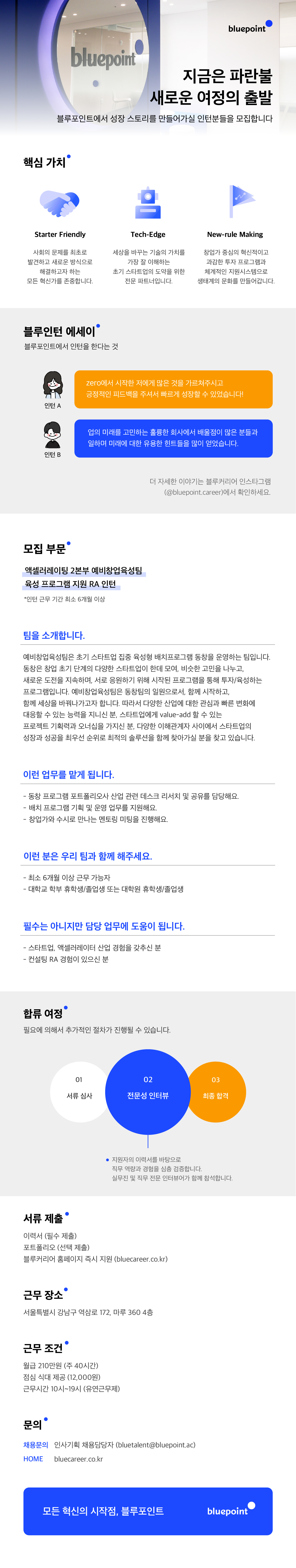 블루포인트와 초기 스타트업의 힘찬 도약을 이끌어내고 스타트업 생태계의 확장과 성장을 함께 경험하실 인재를 찾습니다. 많은 지원 부탁드립니다.