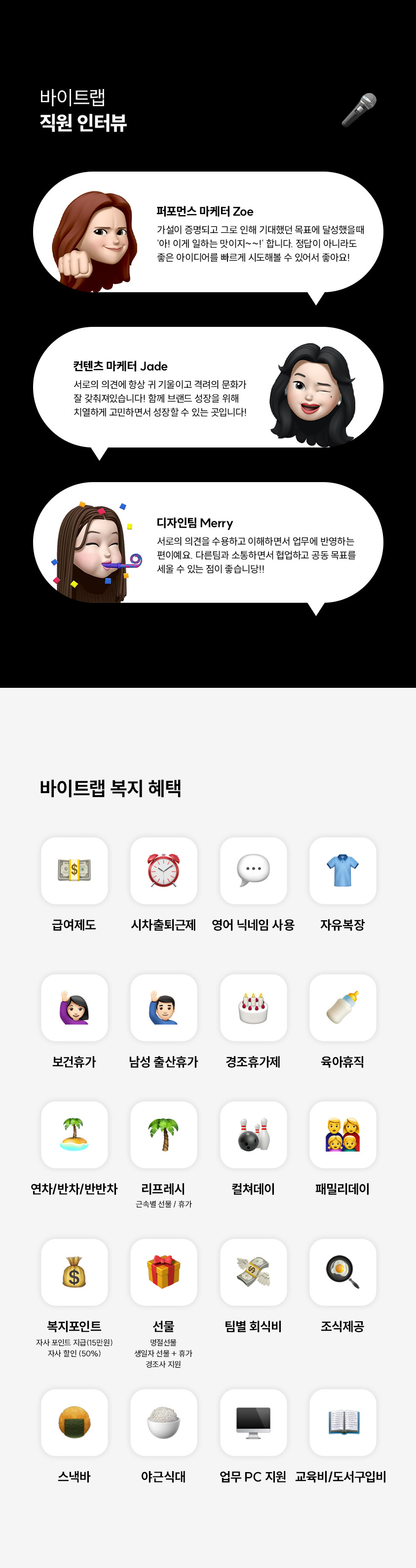 또한, 팀 바이트랩은 유니콘 스타트업, AI tech 스타트업, 전략 컨설팅펌, 대기업, 미디어 커머스 등 다양한 분야에서 성과를 낸 탑 탤런트가 모여 밀도 높은 조직 성장을 하고 있습니다.