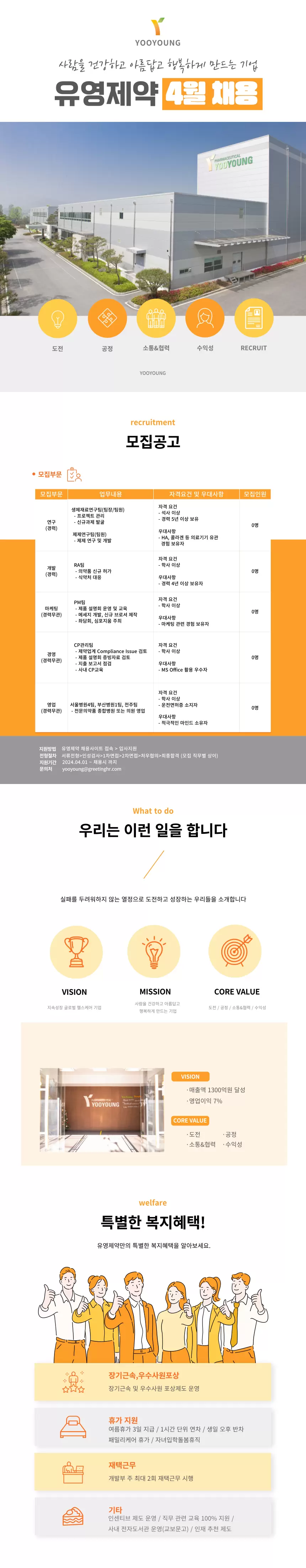 유영제약은 1981년 창립 이래로 "정도경영"이라는 창업정신과 "사람을 건강하고 아름답고 행복하게 만드는 기업"이라는 경영철학을 바탕으로, 끊임없이 연구하고 노력하며 국민건강증진을 위해 최선을 다하고 있습니다.
