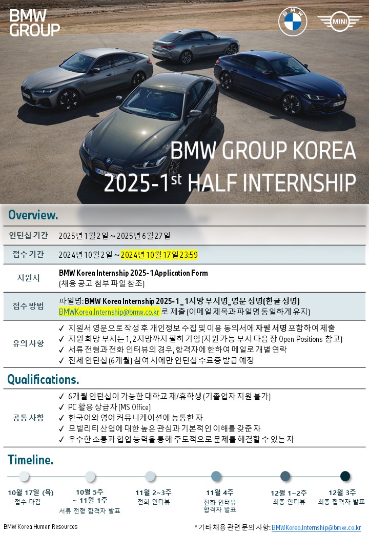 - 제출 서류: BMW Korea Internship 2025-1 Application Form (채용 공고 첨부 파일 참조)
