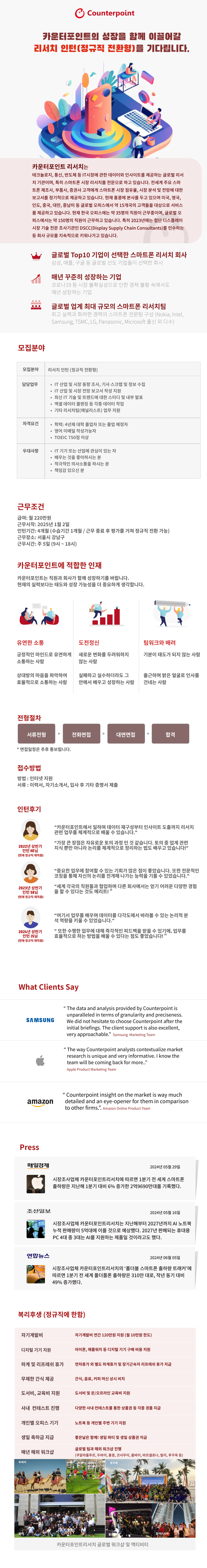 카운터포인트리서치는 테크놀로지, 통신, 반도체 등 IT시장에 관한 데이터와 인사이트를 제공하는 글로벌 리서치 기관이며, 특히 스마트폰 시장 리서치를 전문으로 하고 있습니다. 전세계 주요 스마트폰 제조사, 부품사, 증권사 고객에게 스마트폰 시장 점유율, 시장 분석 및 전망에 대한 보고서를 정기적으로 제공하고 있습니다. 현재 홍콩에 본사를 두고 있으며 미국, 영국, 인도, 중국, 대만, 중남미 등 글로벌 오피스에서 약 15개국의 고객들을 대상으로 서비스를 제공하고 있습니다. 현재 한국 오피스에는 약 35명의 직원이 근무중이며, 글로벌 오피스에서는 약 150명의 직원이 근무하고 있습니다. 특히 2023년에는 첨단 디스플레이 시장 기술 전문 조사기관인 DSCC(Display Supply Chain Consultants)를 인수하는 등 회사 규모를 지속적으로 키워나가고 있습니다.