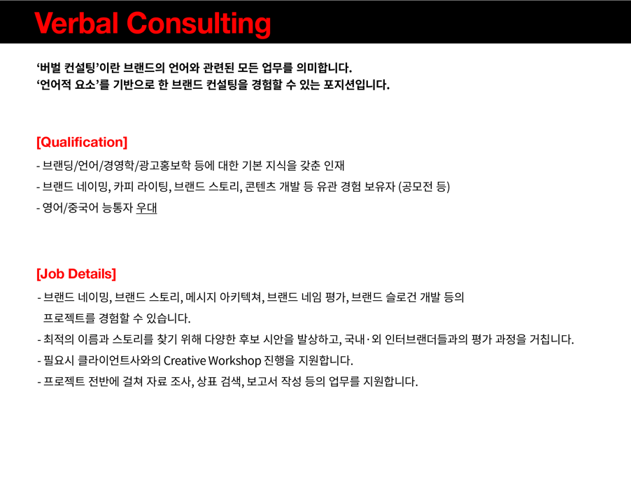 - ‘버벌 컨설팅’이란 브랜드의 언어와 관련된 모든 업무를 의미합니다. ‘언어적 요소’를 기반으로 한 브랜드 컨설팅을 경험할 수 있는 포지션입니다.