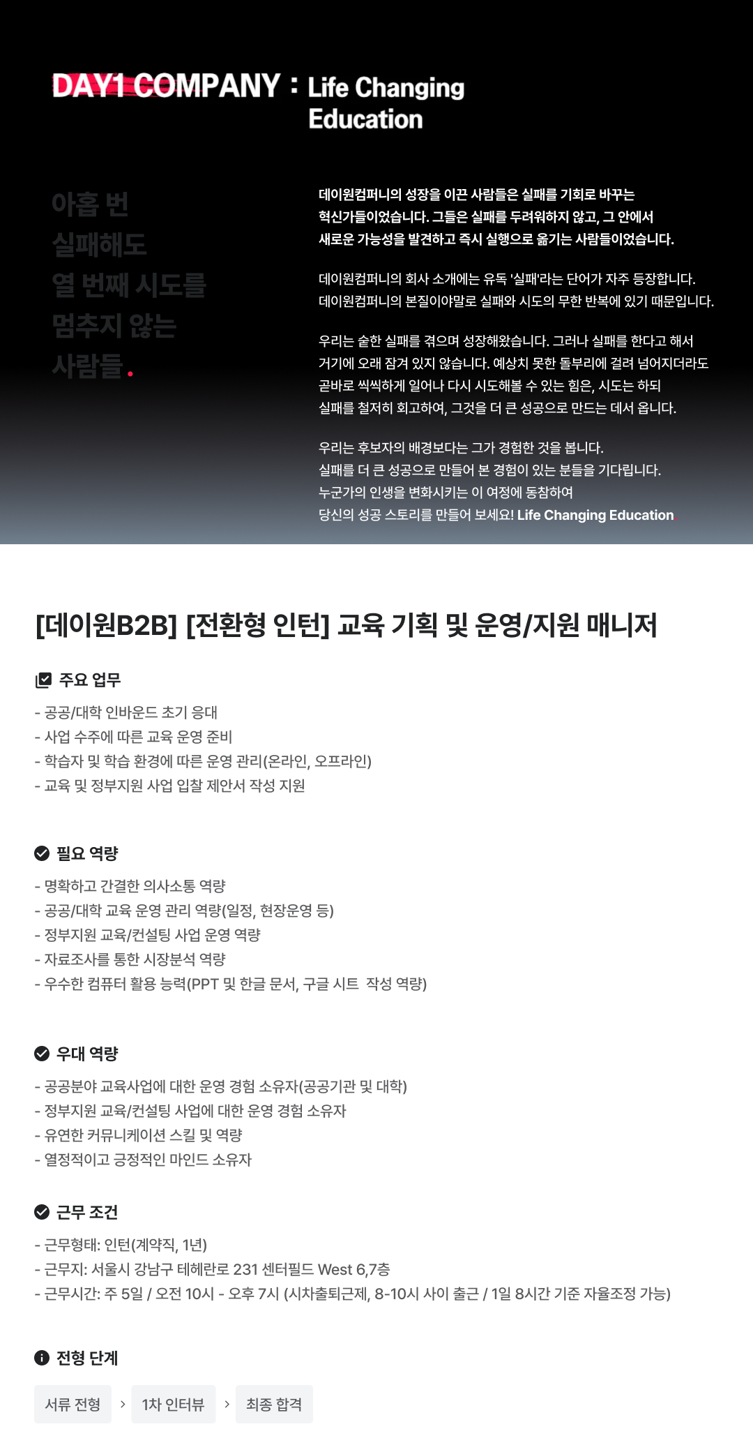 데이원컴퍼니 [데이원 B2B] [전환형 인턴] 교육 기획 및 운영지원 매니저