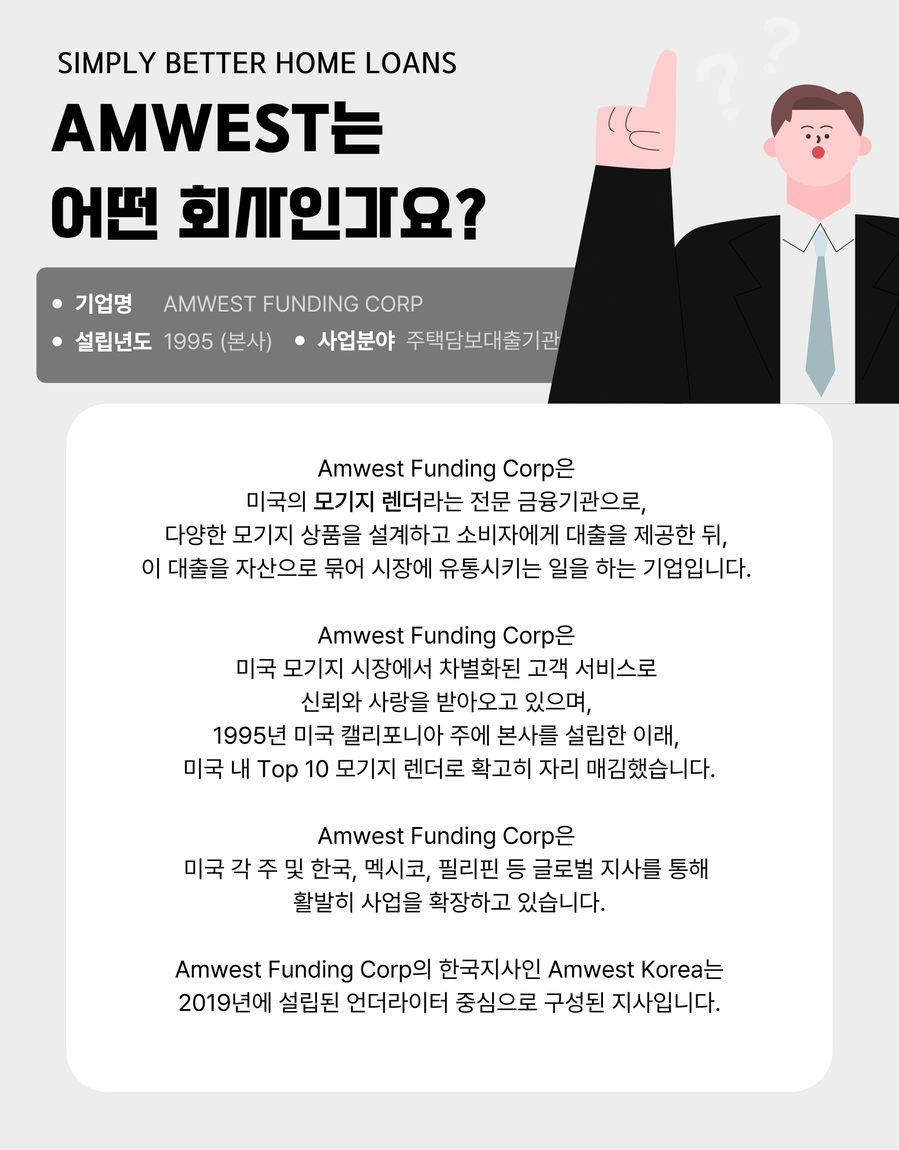 Amwest Funding Corp은 미국의 모기지 렌더라는 전문 금융기관으로, 다양한 모기지 상품을 설계하고 소비자에게 대출을 제공한 뒤, 이 대출을 자산으로 묶어 시장에 유통시키는 일을 하는 기업입니다.