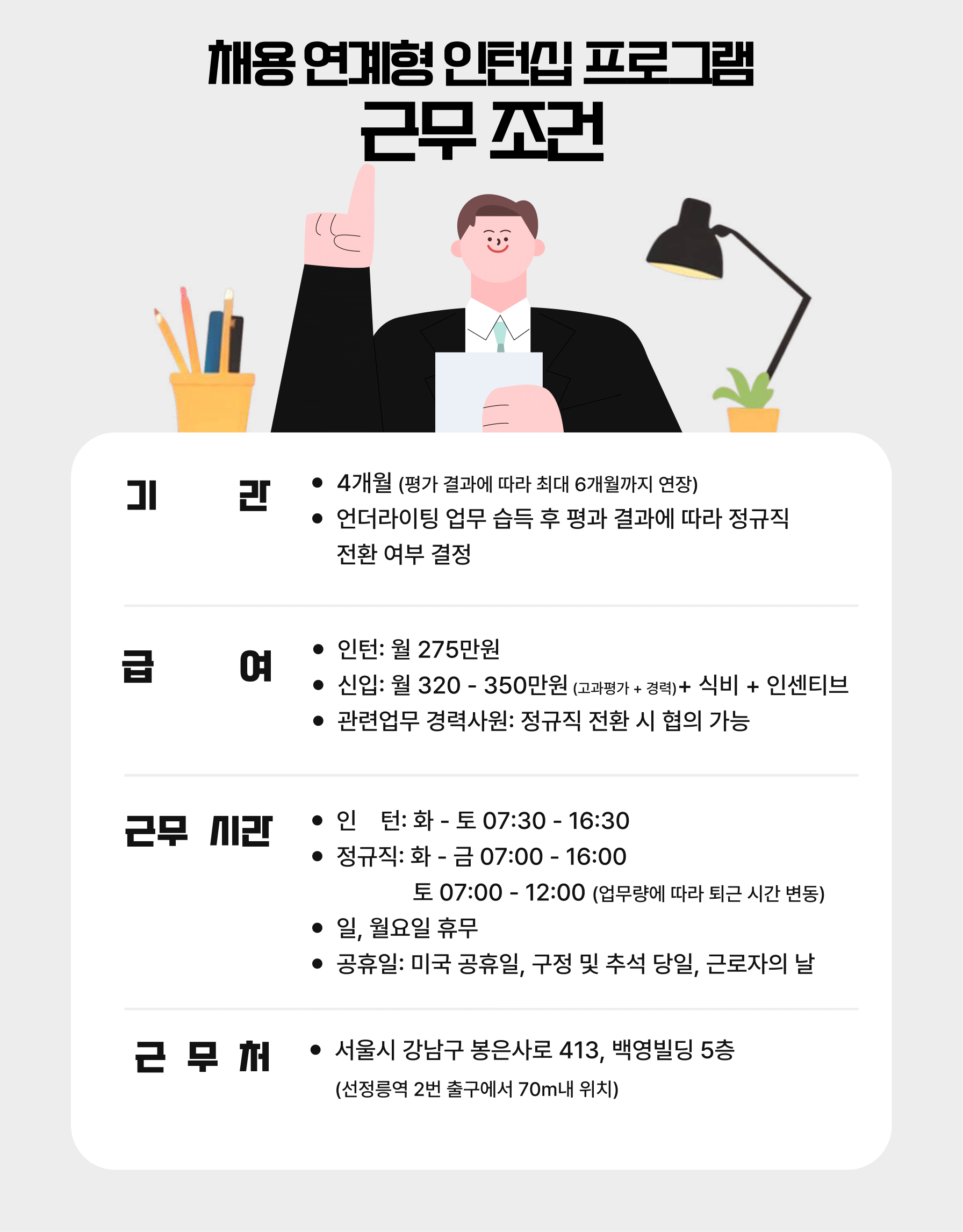 - 경력: 무관 (인턴십 기간 중 트레이닝 프로그램 제공)
