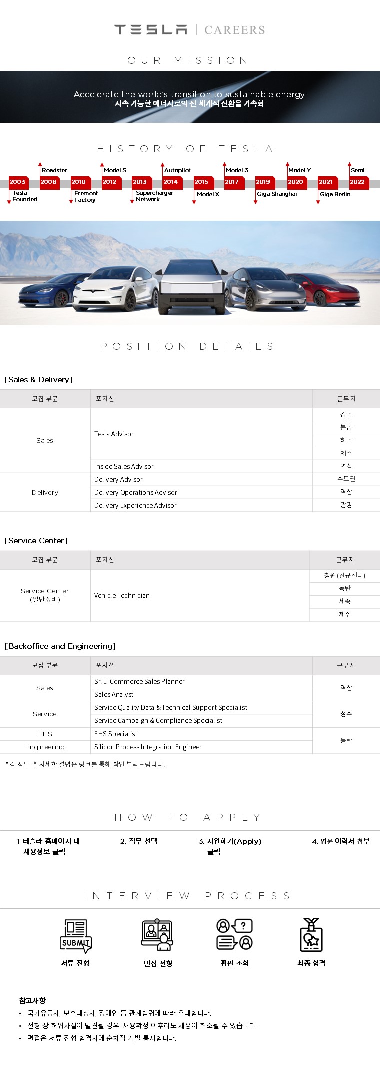 Tesla는 전기차를 효율적이고 빠르며 더 재미있게 운전 할 수 있다는 것을 증명하고자 하는 엔지니어 그룹에 의해 2003년에 설립되었으며 순수 전기차뿐만 아니라 유용하게 활용 가능한 청정 에너지를 생산하고 저장할 수 있는 제품도 함께 생산하고 있습니다. Tesla는 전 세계가 화석 연료에 대한 의존을 줄이고 배출가스 없는 미래로 한 발 더 빠르게 나아갈수록 모두에게 유익하다는 것을 믿고 있습니다.