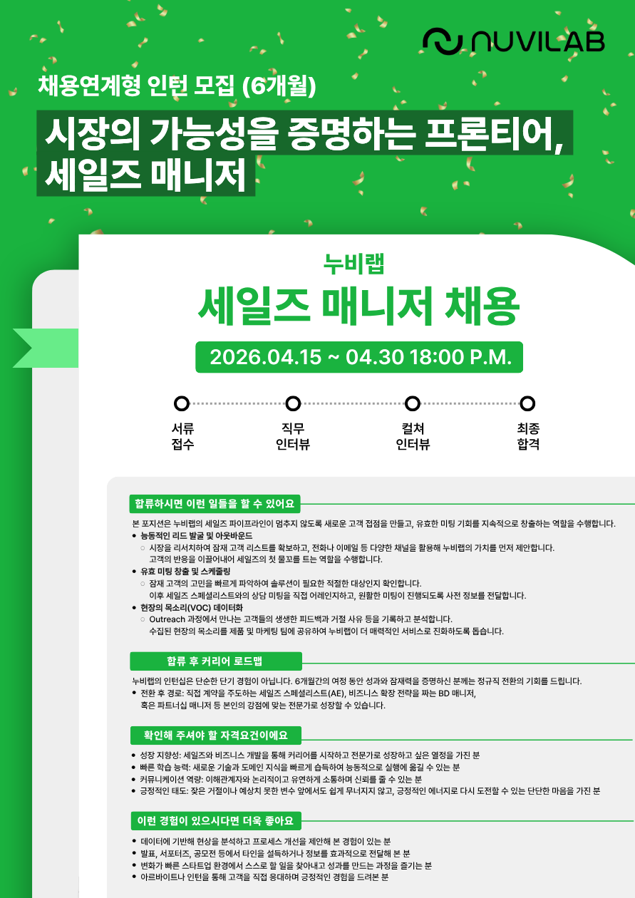 2018년 말에 창업하여 2022년 10월 탑티어 투자사들로부터 100억 규모의 시리즈 A 투자 유치를 완료하였고, 국내외 파트너사들과 협업하며 빠르게 성장해 나가고 있습니다. ESG, 헬스케어, 푸드테크, AI 분야는 세계적으로 가장 빠르게 성장하고 있는 산업군에 속합니다. 누비랩과 함께 변화의 중심에서 인류와 지구의 건강을 지켜나갈 동료를 모십니다.