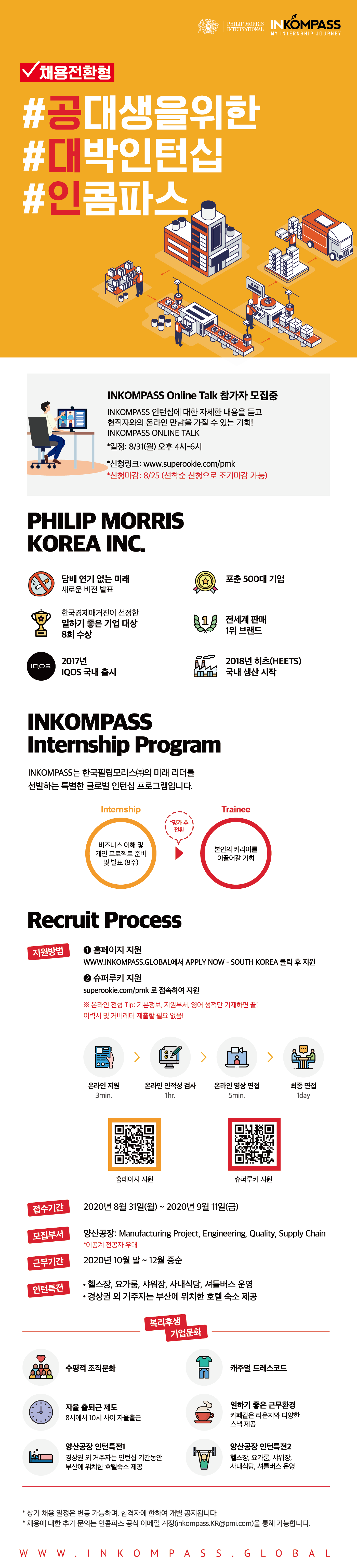 담배산업의 글로벌 기업, 한국필립모리스(주)에서 글로벌 인턴십 프로그램인 INKOMPASS 하반기 채용을 진행함과 동시에 INKOMPASS ONLINE TALK 를 진행합니다.