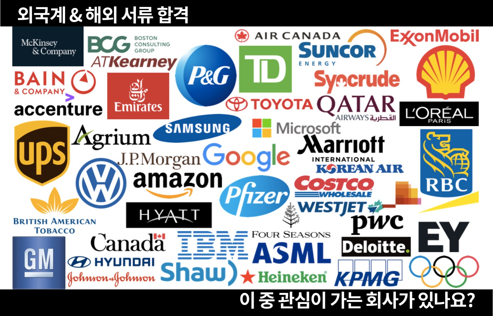 Google, Amazon, Samsung, Microsoft, Pfizer, McKinsey, Bain, BCG, Accenture, AT Kearney, Emirates, Qatar, Air Canada, Korean Air, UPS, Agrium, Volkswagen, JP Morgan, Hyundai, British American Tobacco, General Motors, Johnson & Johnson, Govt of Canada, Hyatt, Marriott, Four Seasons, IBM, Shaw, ASML, Heineken, Deloitte, KPMG, EY, PWC, RBC, TD Bank, P&G, Suncor Energy, Shell, ExxonMobil, L'Oreal, Olympics, Costco 등