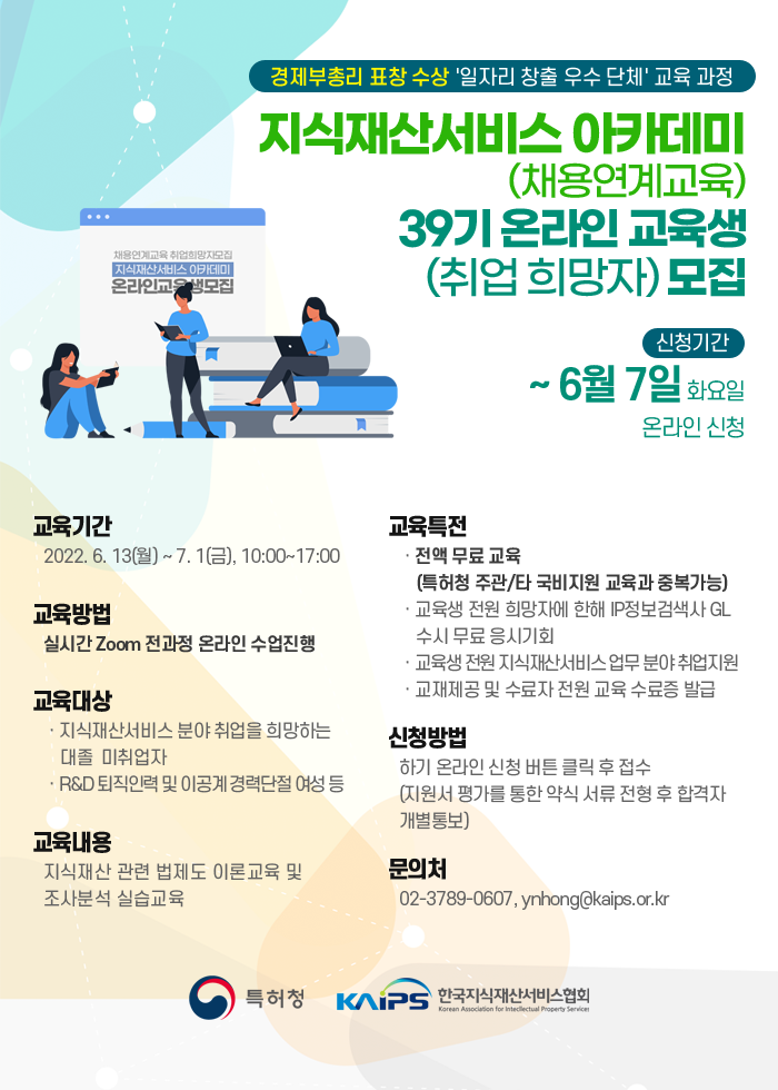 [특허청] IP서비스 아카데미(채용연계교육) 39기 온라인 교육생 모집(~6/7)