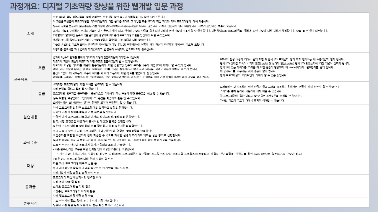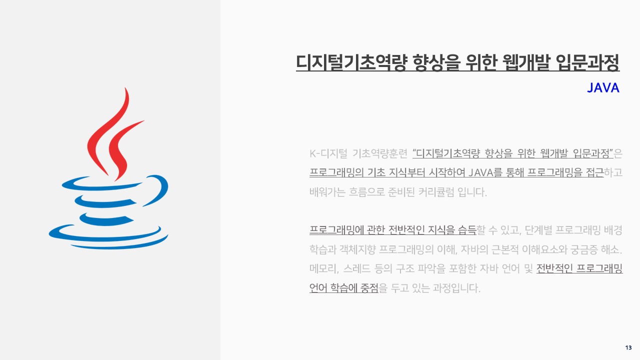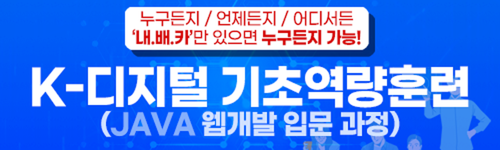 K-디지털 기초역량훈련 “디지털기초역량 향상을 위한 웹개발 입문과정”은 프로그래밍의 기초 지식부터 시작하여 JAVA를 통해 프로그래밍을 접근하고 배워가는 흐름으로 준비된 커리큘럼 입니다.