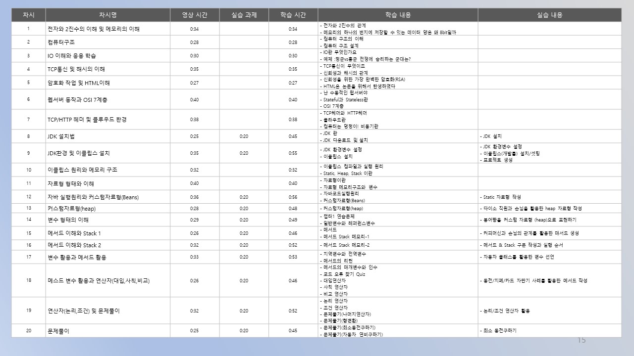 프로그래밍에 관한 전반적인 지식을 습득할 수 있고, 단계별 프로그래밍 배경 학습과 객체지향 프로그래밍의 이해, 자바의 근본적 이해요소와 궁금증 해소. 메모리, 스레드 등의 구조 파악을 포함한 자바 언어 및 전반적인 프로그래밍 언어 학습에 중점을 두고 있는 과정입니다.