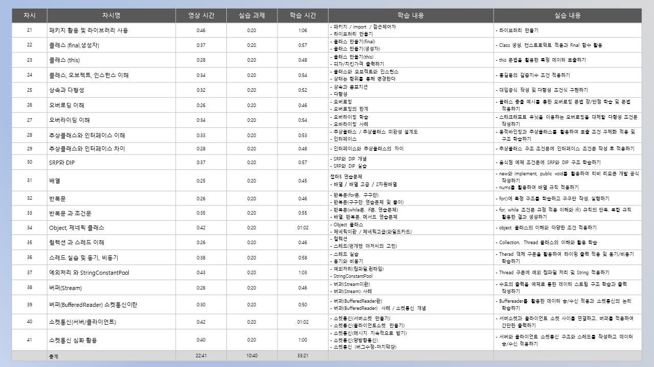 - 세계적으로 가장 많이 사용하는 자바의 기초활용능력과 객체지향 프로그래밍에 대해 학습합니다.