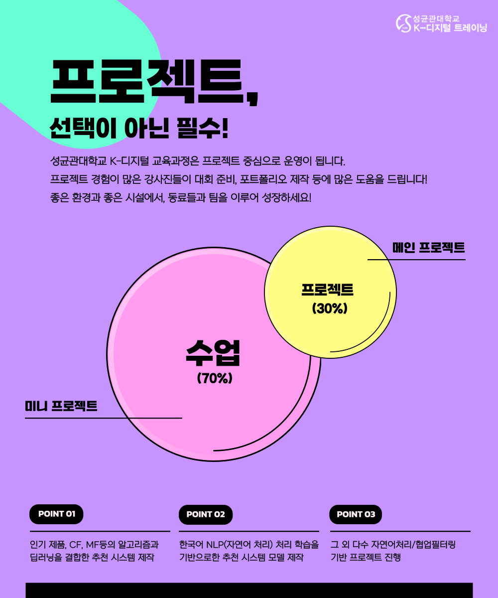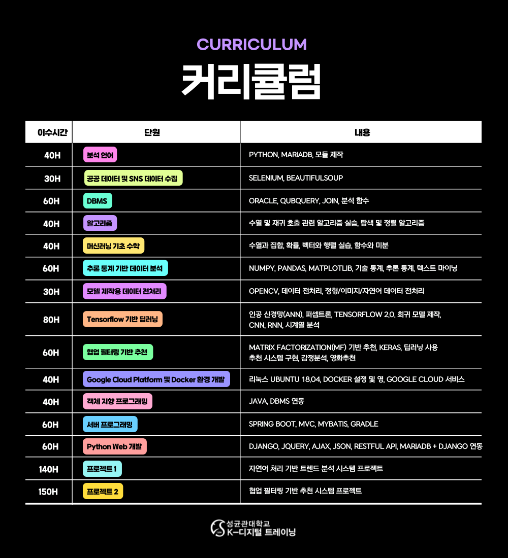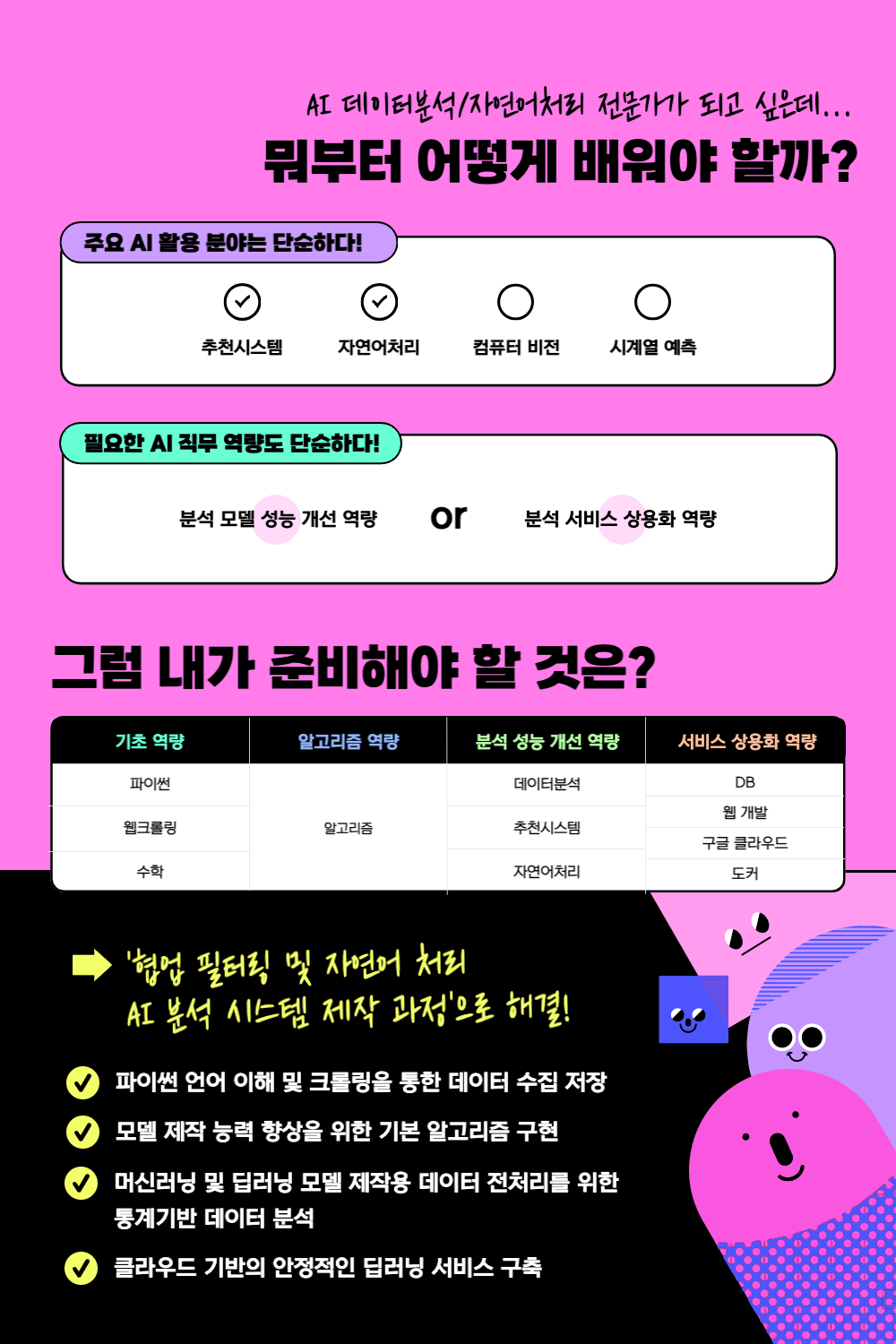 >> AI에 대해 기초를 배우고, 자연어 처리, 협업 필터링에 대한 학습을 토대로, 실무에서 활용되는 AI 데이터 분석 역량을 기르는 교육 과정입니다! 기초부터 실무 교육까지!!