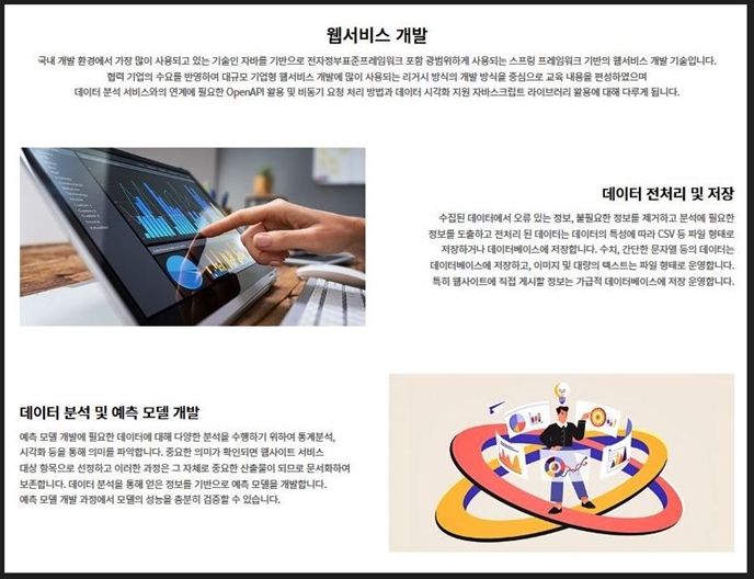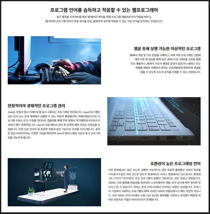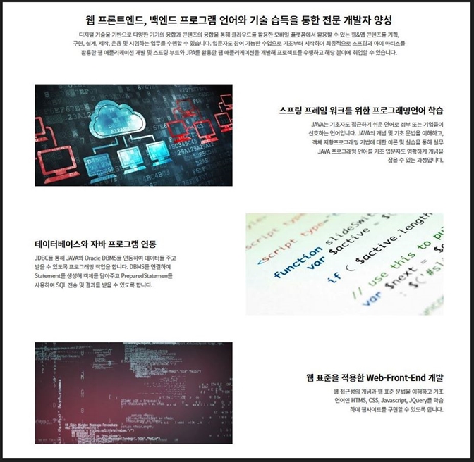 - 웹 프론트엔드, 백엔드 프로그램 언어와 기술 습득을 통한 전문 개발자 양성