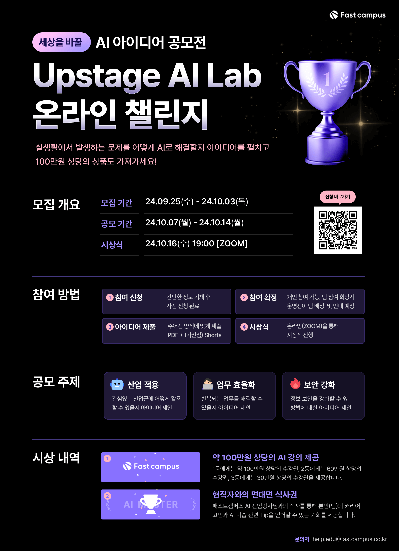 😀AI로 취업은 하고싶은데 AI와 관련된 경험이 없어서 고민이라면😵💫 아이디어만 내도 수상확률 UP! Upstage AI Lab 온라인 챌린지에 참여해보세요