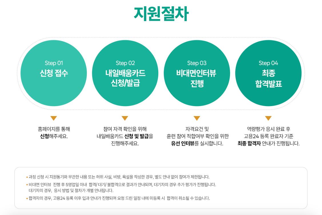 국민내일배움카드 발급이 가능하고, 09시~18시 수업 참여가 가능하신 분 / 졸업 후 미취업자, 대학 졸업예정자, 대학 재학생(졸업까지 수업연한이 2년 이내인 휴학생) 4년제 대학 재학 or 졸업 이상