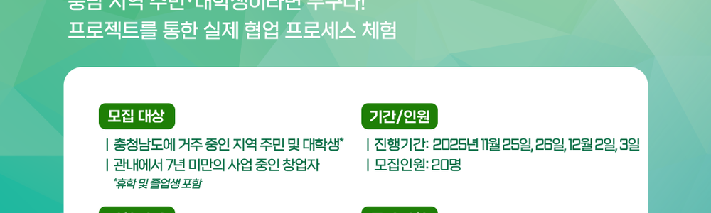 창업에 대한 관심 또는 지역 문제 해결형 아이디어를 실현하고 싶은 충남권 소재 대학교 재학생 및 휴학생, 사업화 의지를 가진 충남권 예비 창업자