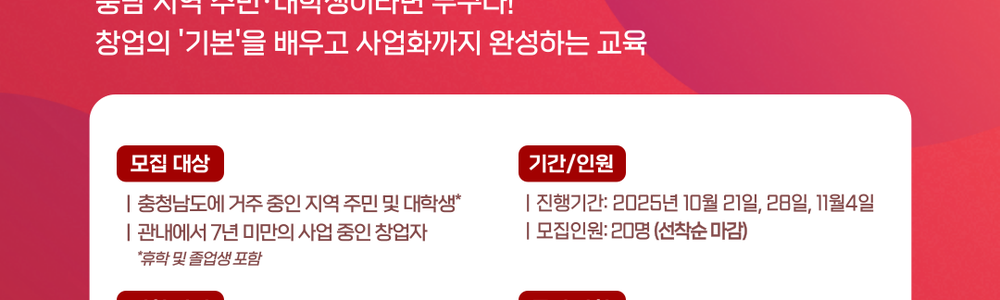 창업의 '기본기'를 탄탄히 다지고 싶은 충남 지역 주민 및 대학생, 이미 아이디어가 있지만 사업화에 어려움을 겪는 7년 이내 초기 창업자