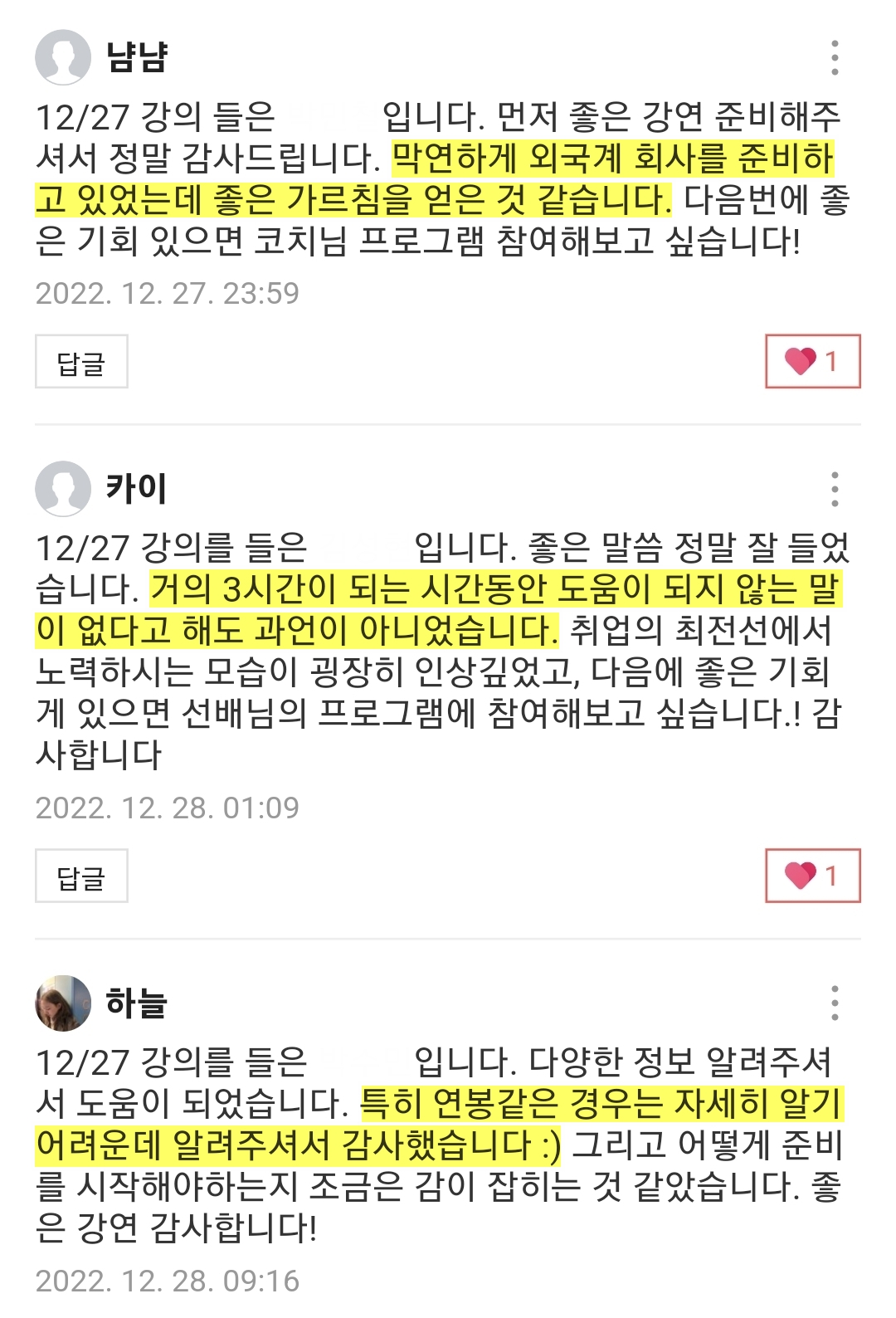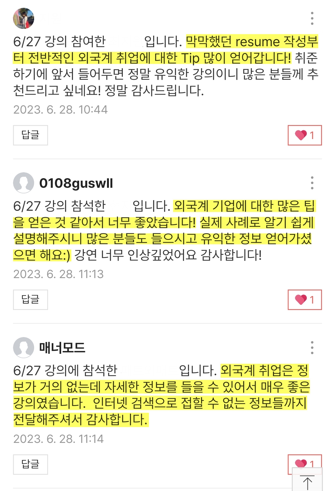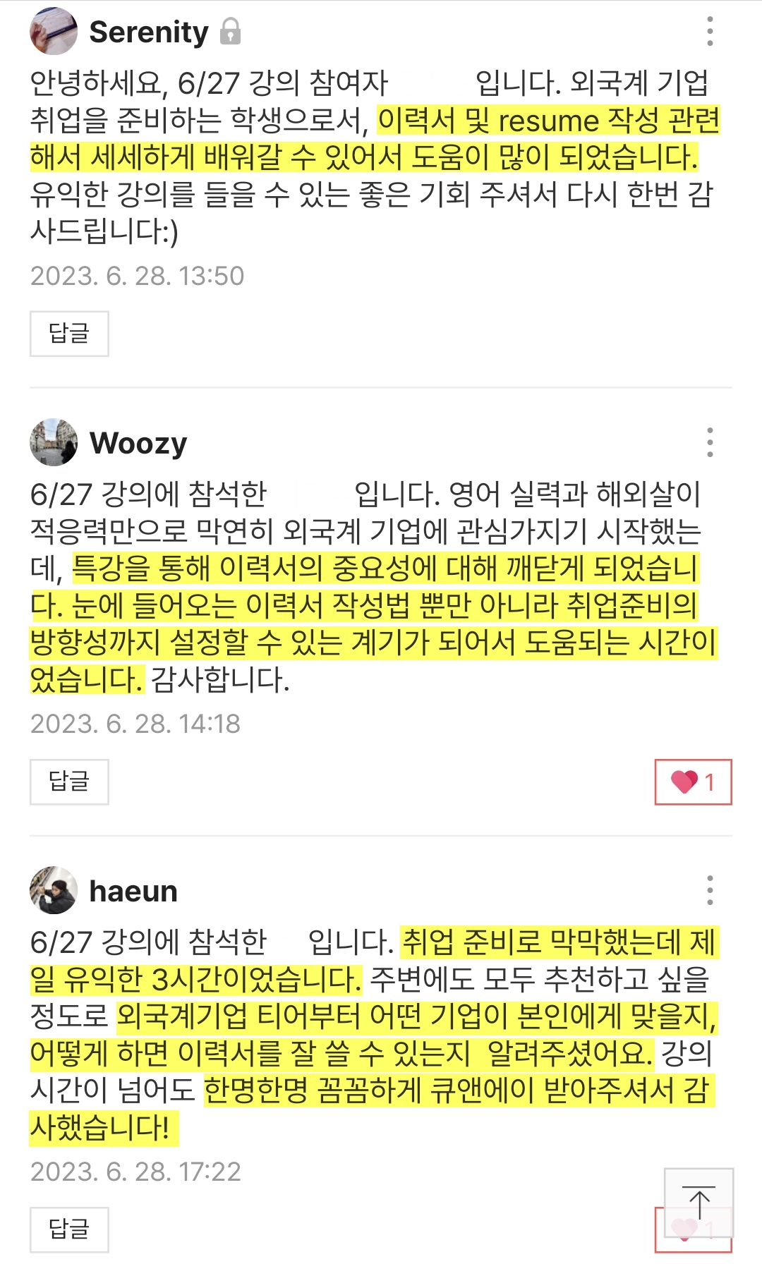 1) 신청서 작성 시 가지고 계신 취업 관련 질문을 적어주시면 특강에서 답변드립니다.