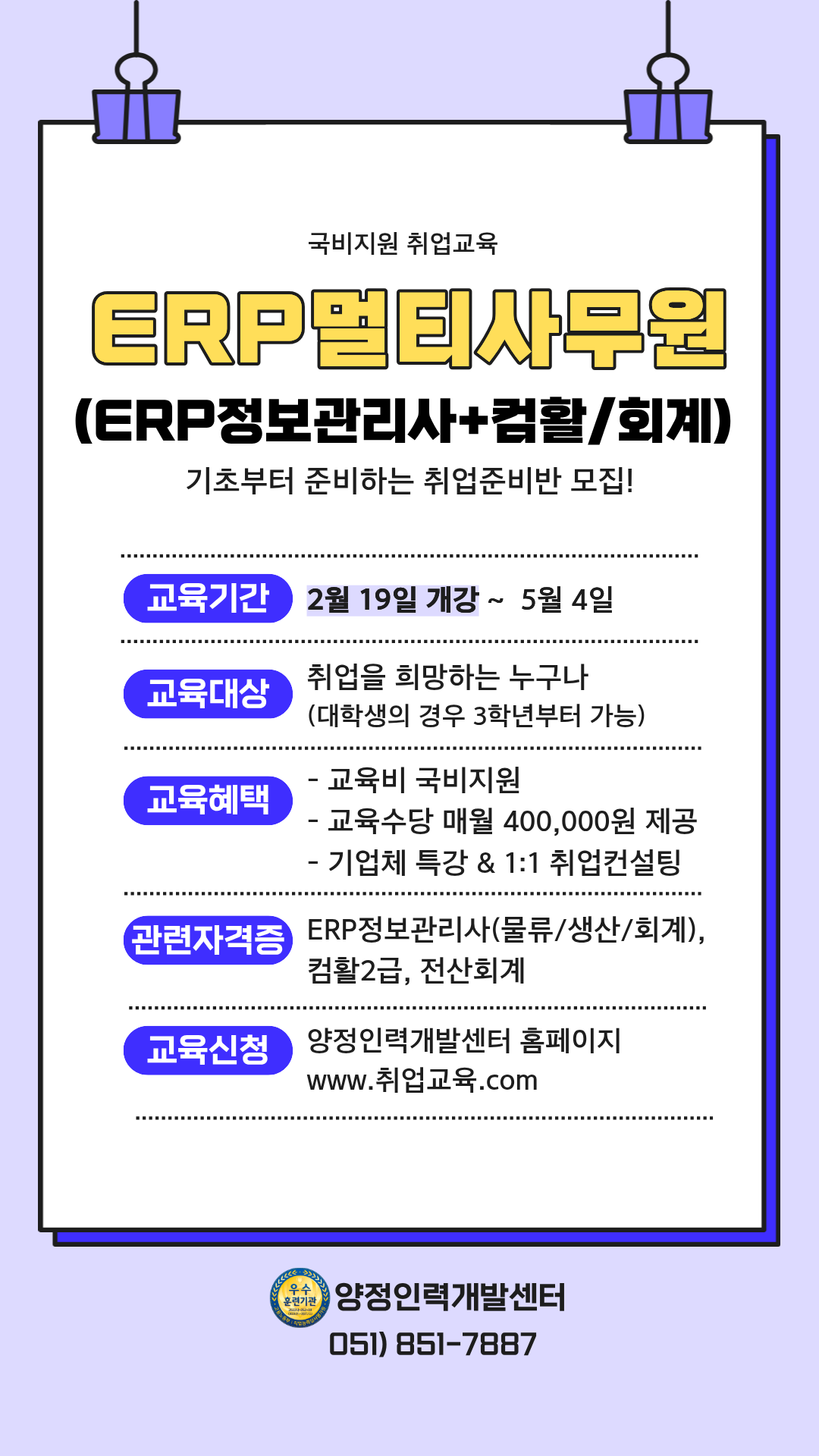 ✅국비지원 <erp멀티사무원 양성과정> 취업준비생을 모집합니다!🚀물류・ERP・사무직 취업준비생들의 많은 지원바랍니다!